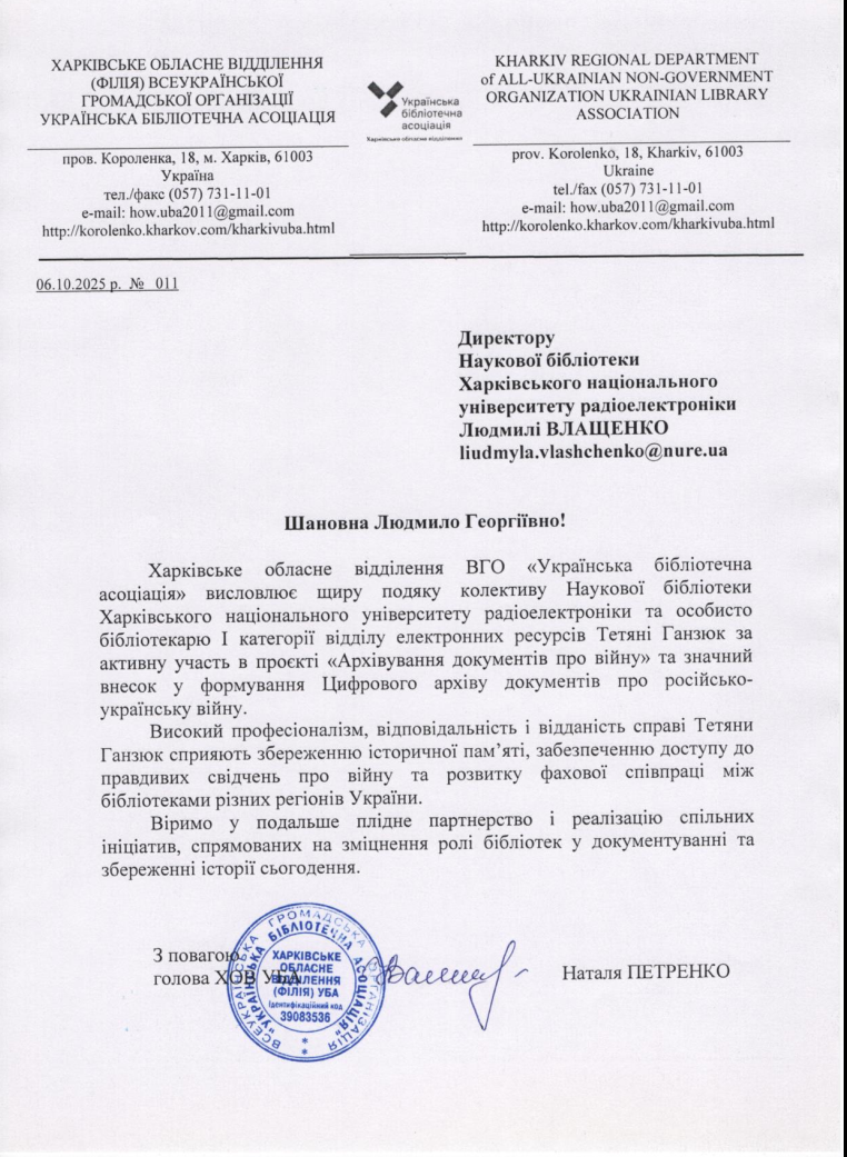 Харківське обласне відділення ВГО «Українська бібліотечна асоціація» щиро дякує колективу Наукової бібліотеки Харківського національного університету радіоелектроніки та бібліотекарю І категорії відділу електронних ресурсів Тетяні Ганзюк за активну участь у проєкті «Архівування документів про війну» та вагомий внесок у формування Цифрового архіву документів про російсько-українську війну.