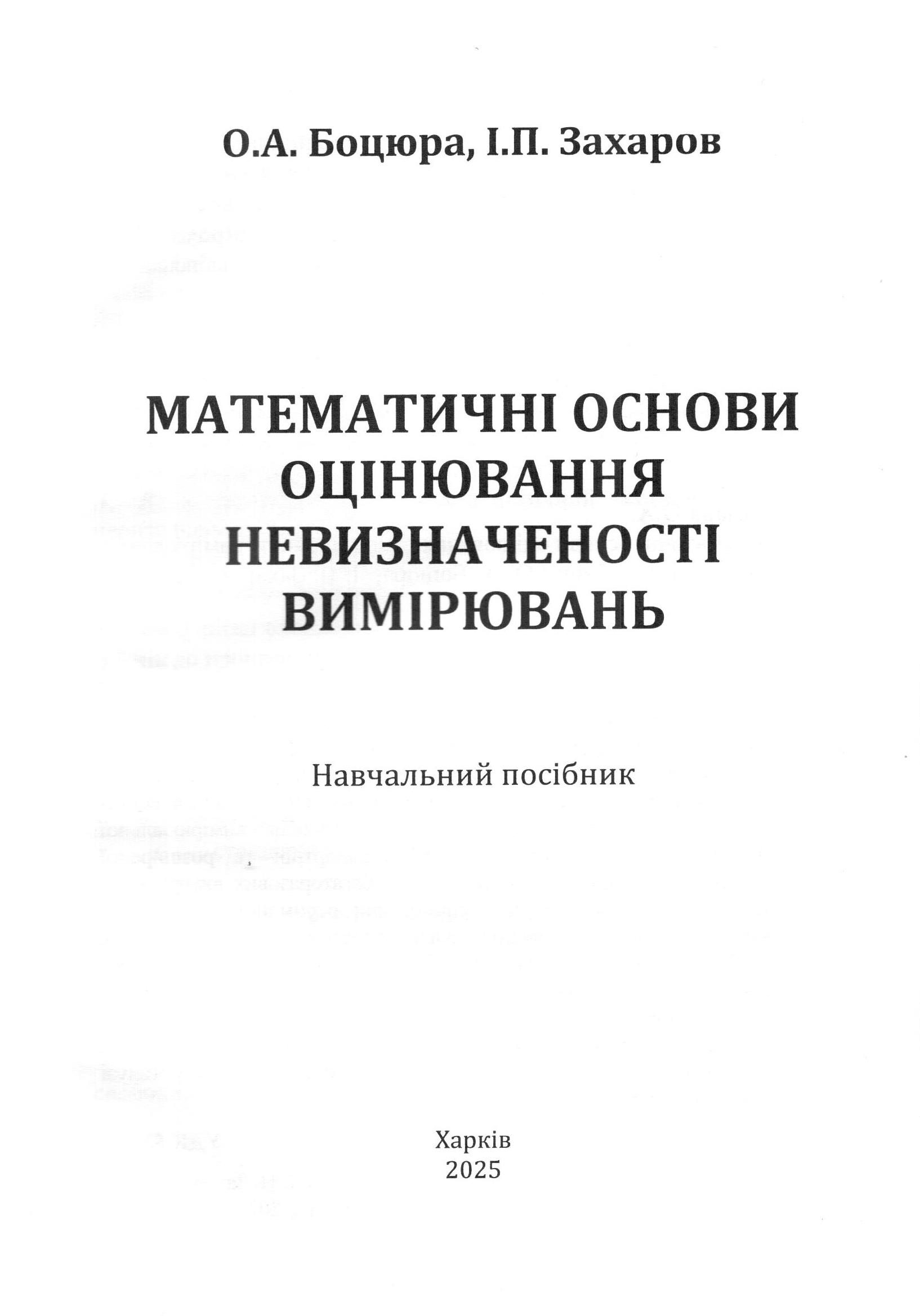 Боцюра О. А. Математичні основи оцінювання невизначеності вимірювань : навч. посібник / О. А. Боцюра, І. П. Захаров. – Харків : Оберіг, 2025. – 136 с. – ISBN 978-966-8689-69-76-5.