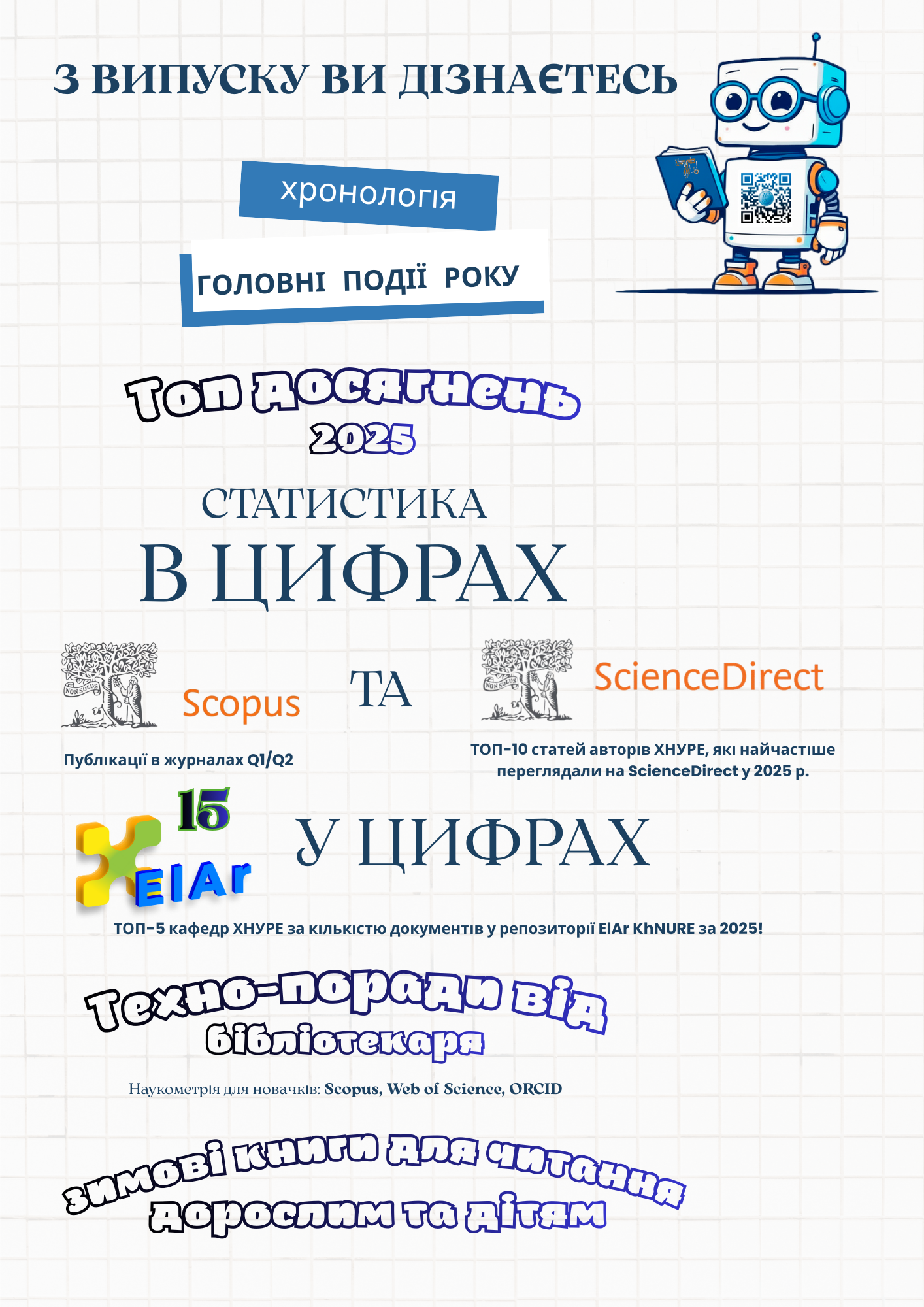 Напередодні казкових Нового року та Різдва Наукова бібліотека Харківського національного університету радіоелектроніки дарує вам теплий святковий подарунок – спеціальний підсумковий випуск електронної газети за 2025 рік! Це чудова нагода згадати яскраві моменти року, подякувати за досягнення та налаштуватися на зимову магію читання!