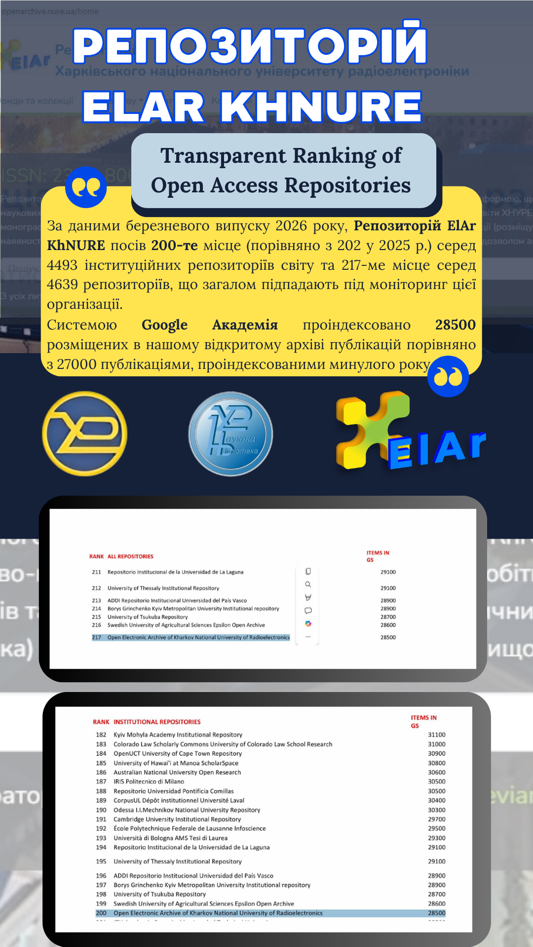 За даними березневого випуску 2026 року Репозиторій ElAr KhNURE посів 200 місце (порівняно з 202 у 2025 р.) серед 4493 інституційних репозиторіїв світу та 217 місце серед 4639 репозиторіїв, що загалом підпадають під моніторинг цієї організації.