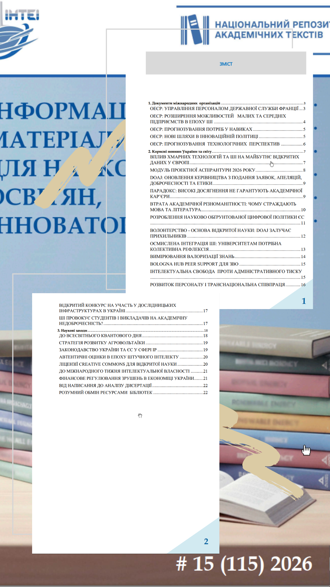 Пропонуємо ознайомитися з черговим п'ятнадцятим у цьому році дайджестом Національного репозитарію академічних текстів. У ньому представлена інформація про актуальні документи міжнародних організацій, корисні новини України і світу, гранти та наукові заходи.