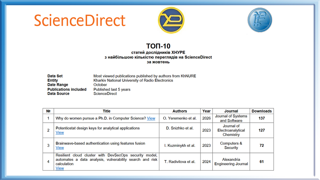 У ТОП-10 статей авторів ХНУРЕ, що найбільш переглядаються на ScienceDirect, у жовтні 2025 р. змінився лідер. Набирає перегляди публікація E.Ábrahám, M. Goulão, M. V. Janičić, S. J. Delany, A. Mersni, O. Yeremenko, Ö. Büyükdağlı, K. Boudaoud, C. Oehlhorn, U. Schmid, C. Büsing, H. Bolke-Hermanns, K. Köhnle, M. Pato, D.S. Cerci, L. Schmid «Why do women pursue a Ph.D. in Computer Science?». Це дослідження міжнародної групи науковців, присвячене вивченню факторів, що впливають на рішення жінок продовжувати навчання в аспірантурі з інформатики, викликає живий інтерес у читачів.