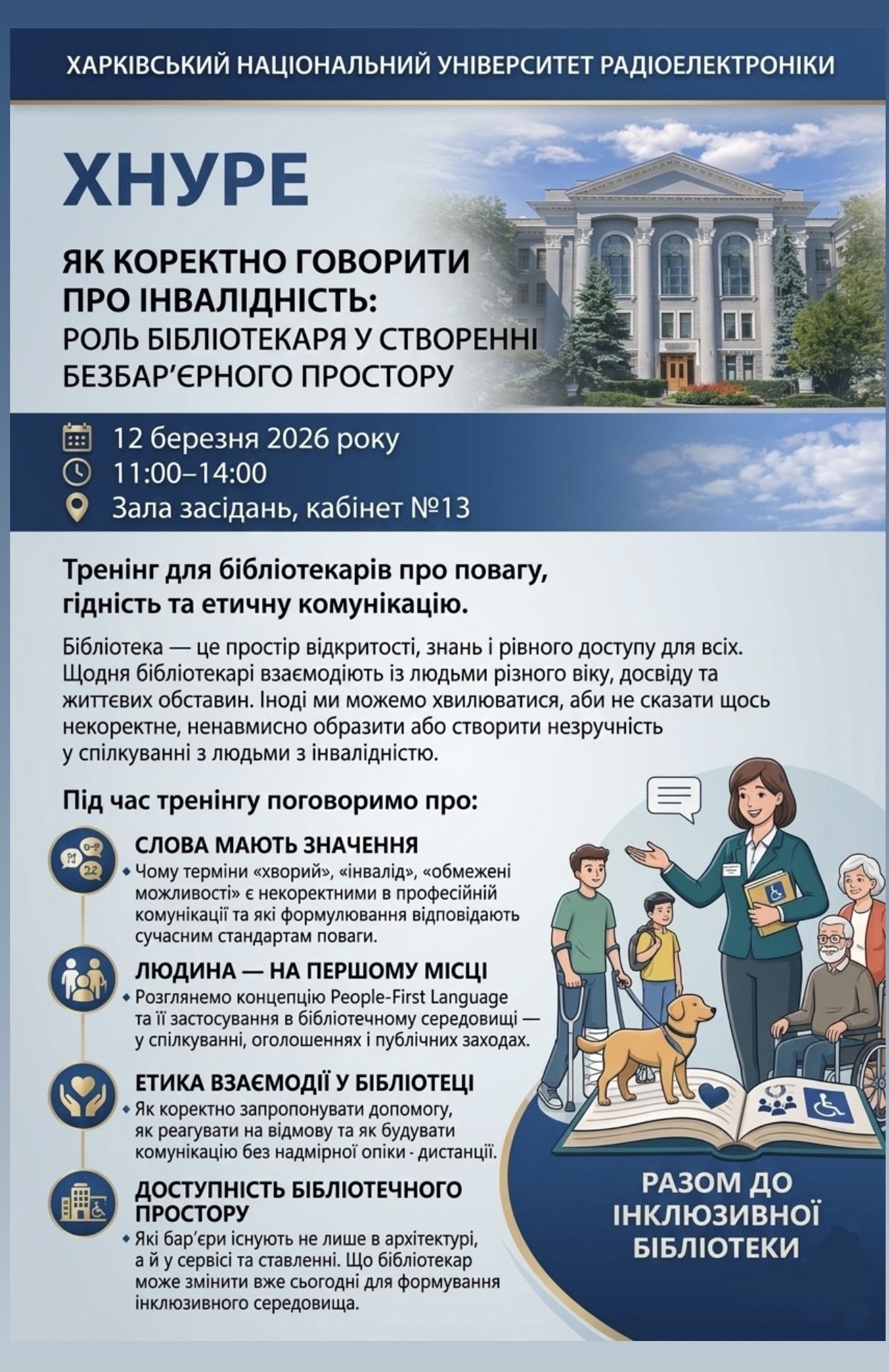 Наукова бібліотека ХНУРЕ спільно зі Служба доступності "ХНУРЕ без обмежень" запрошує взяти участь у тренінгу «Як коректно говорити про інвалідність: роль бібліотекаря у створенні безбар’єрного простору».